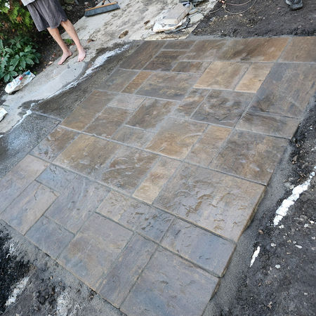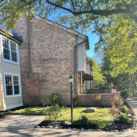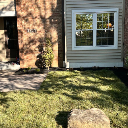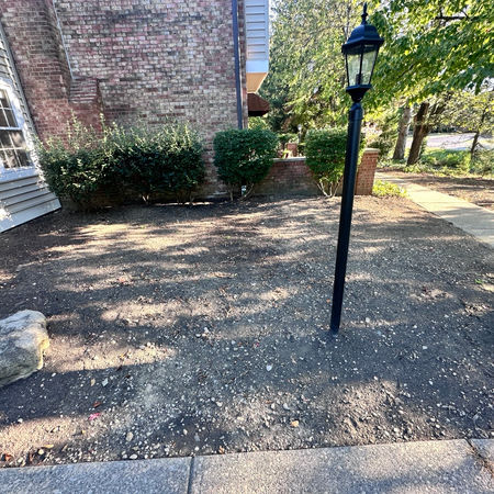 Removed rocks and leveled soil. Created planting beds. Installed small paver patio. Planted small trees, shrubs and perennials and then mulched. Finished the lawn off with fresh turf.